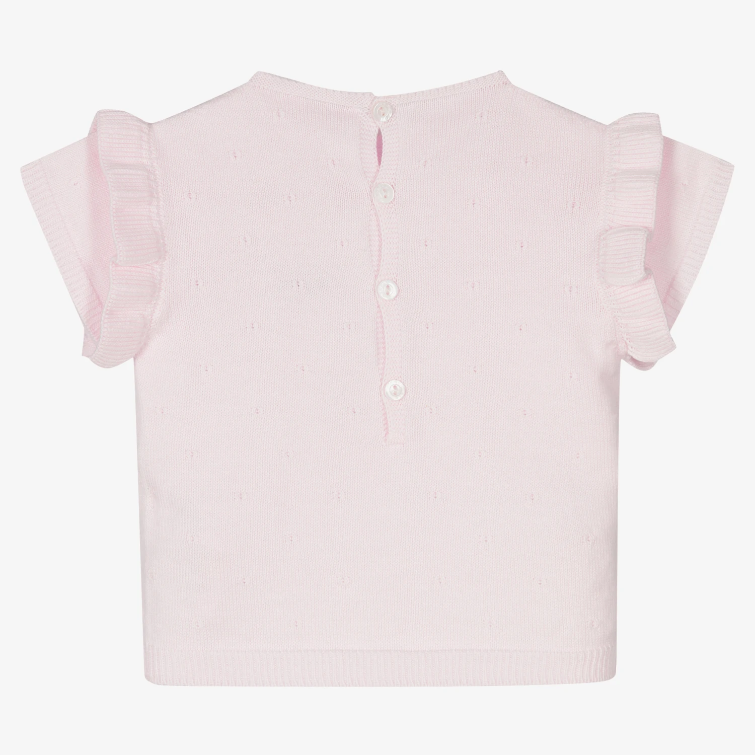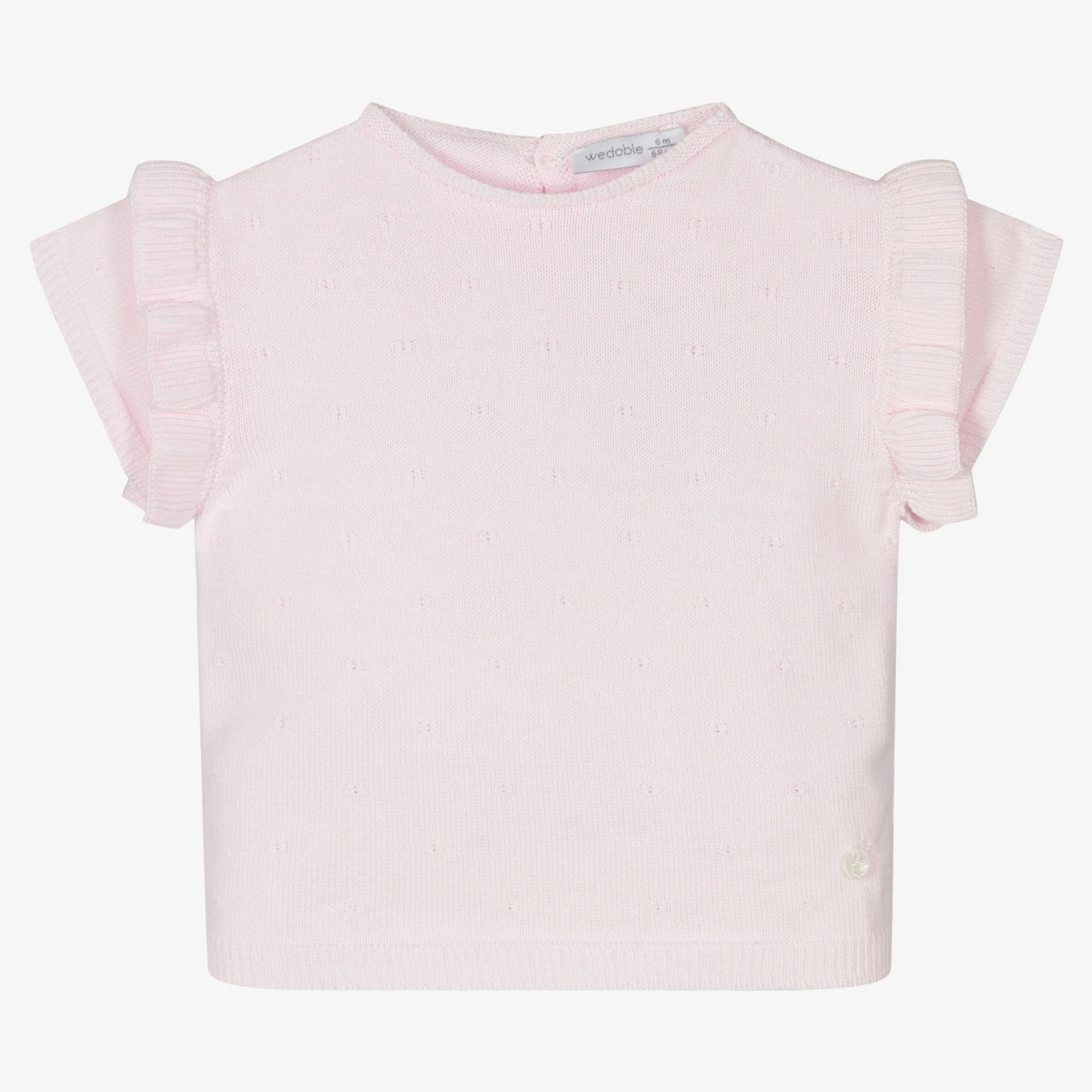 A classic pale pink sweater for baby girls by Wedoble. It has pretty patterned detailing and ribbed frills over the shoulders. Kind to delicate skin, it is finely knitted in soft cotton, with branded button fastenings on the back.