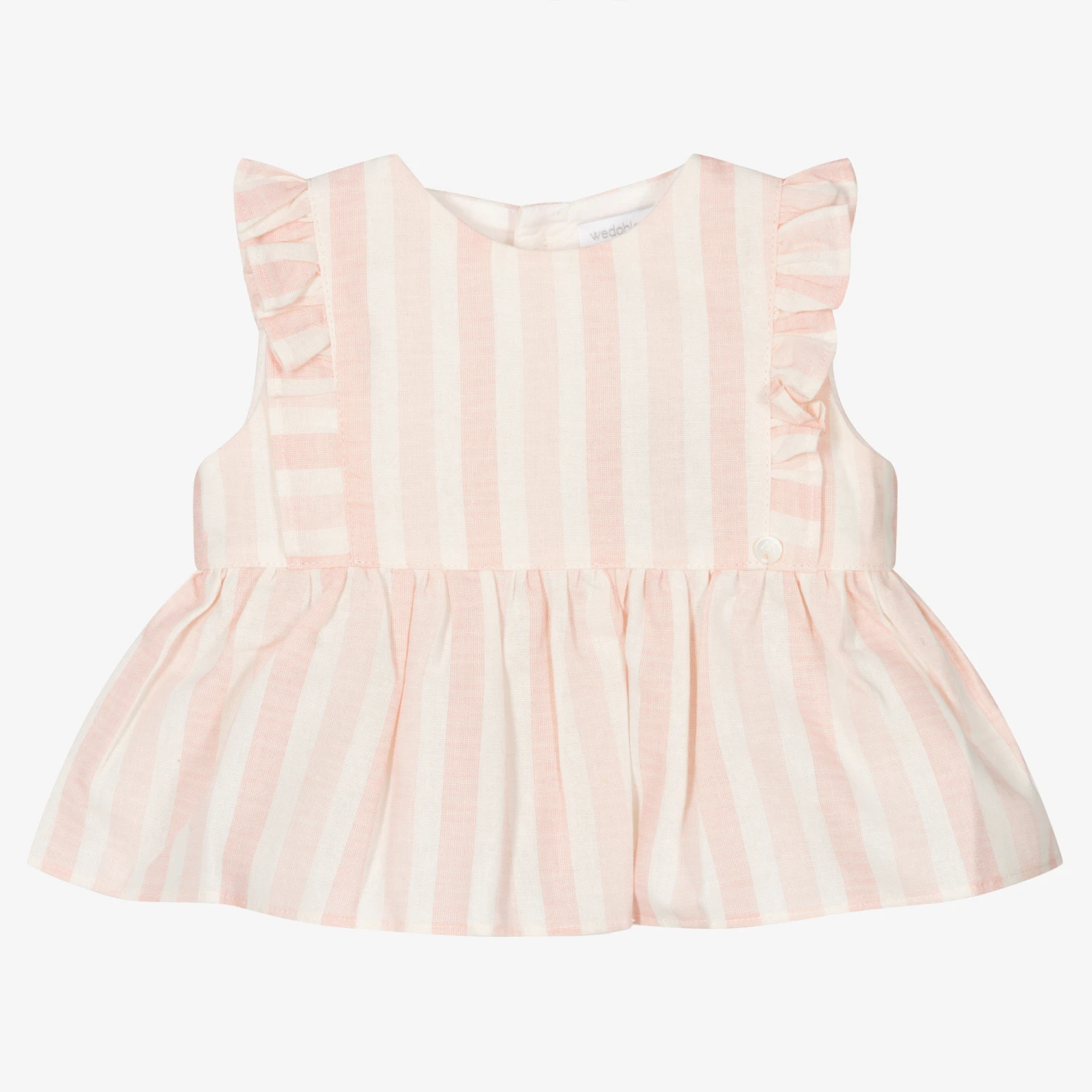 Pale pink and ivory striped blouse for baby girls by Wedoble, with pretty ruffle trims. Cool and comfortable to wear, it is made in a soft cotton and linen blend. There are branded button fastenings on the back, with a small logo charm sewn on the front.