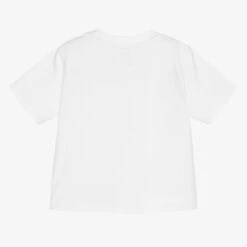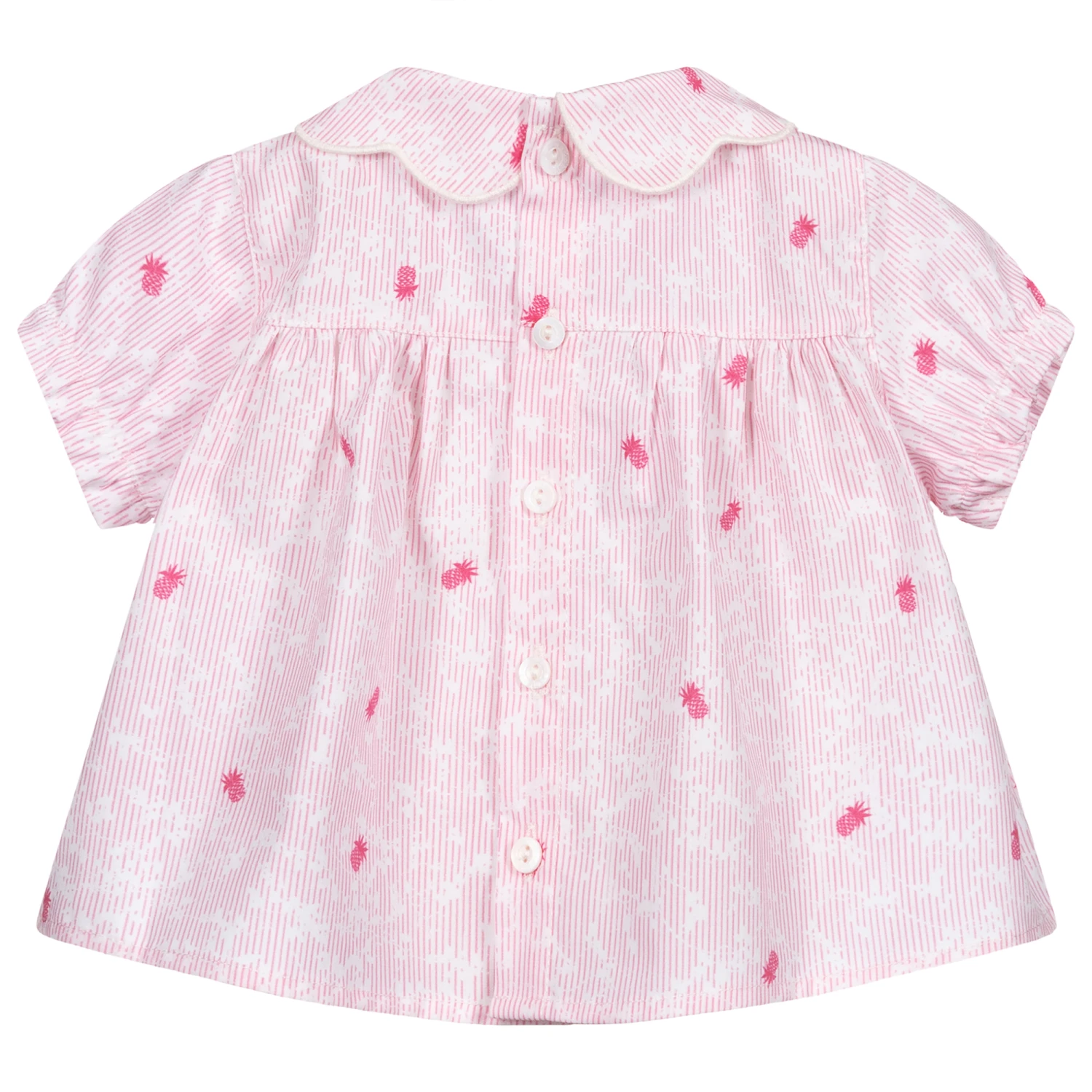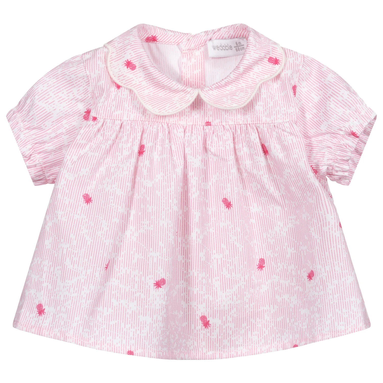 Cute Wedoble blouse for baby girls, patterned with pink stripes and pineapples on a white background. Made in smooth cotton poplin, it has a scalloped collar, elasticated cuffs and gathers from the bodice for a flared fit. There are branded button fastenings on the back.