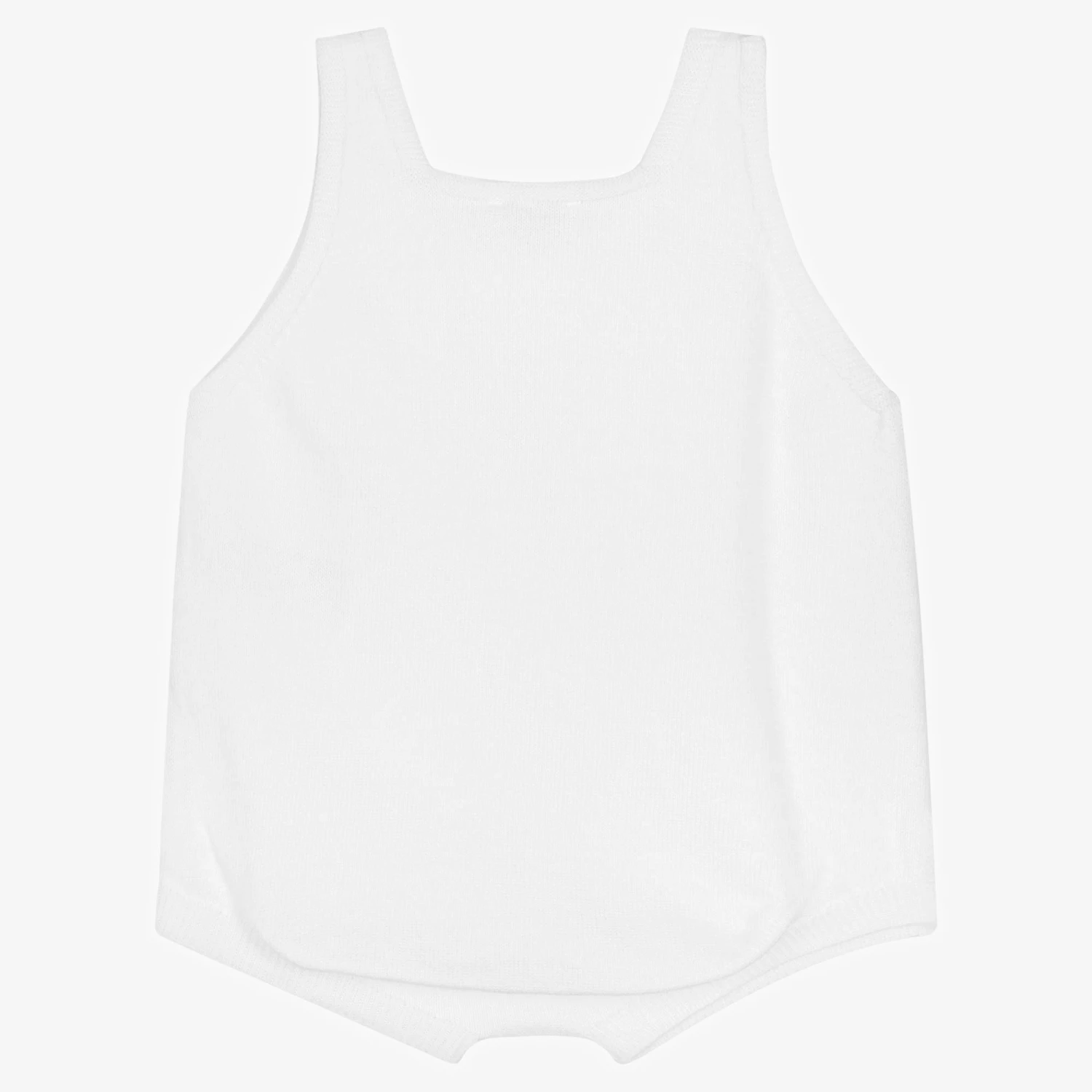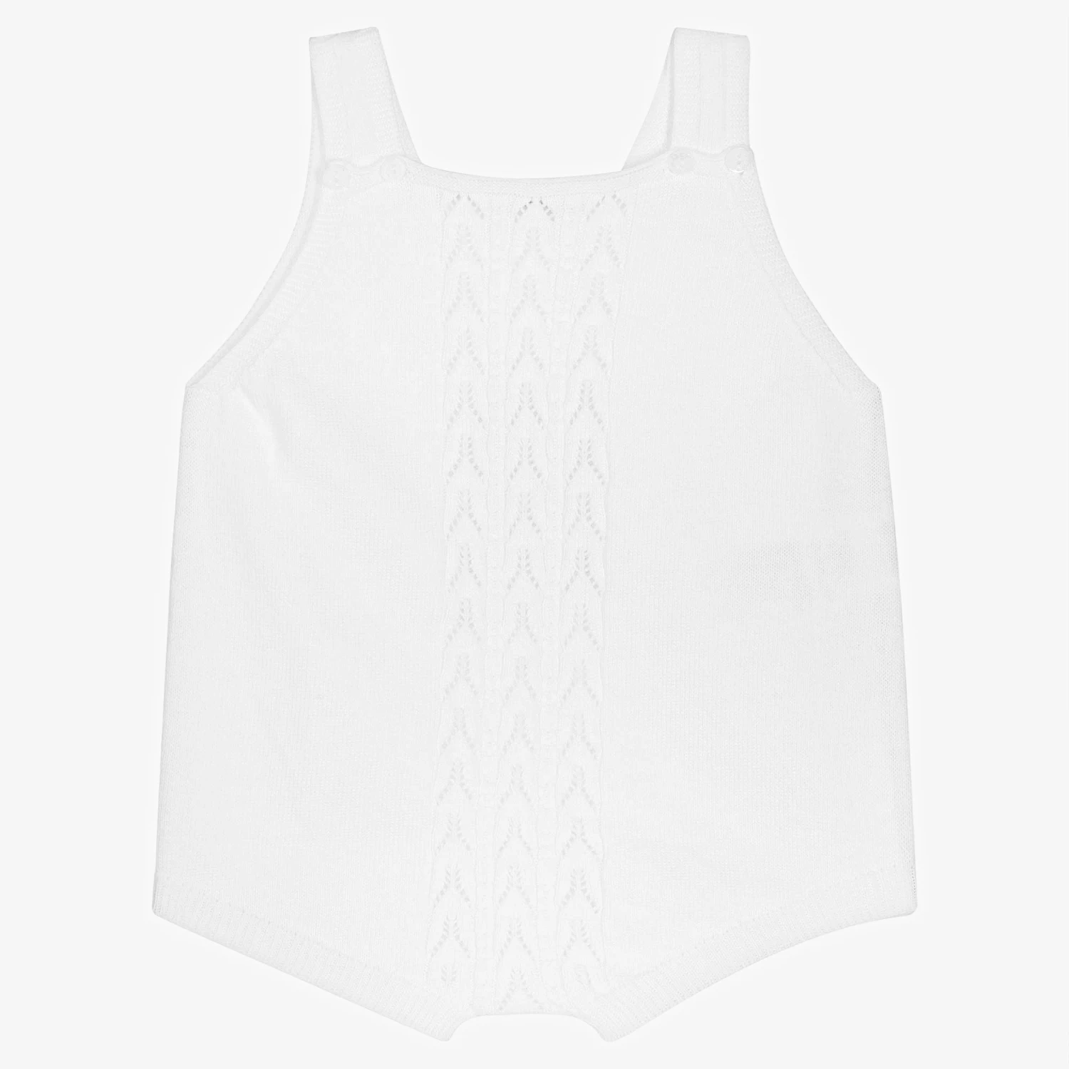 Adorable knitted shortie for baby boys and girls by Portuguese brand, Wedoble. Made with organic cotton, this soft and lightweight babysuit has a lovely lace pattern on the front and button-fastening shoulder straps.
