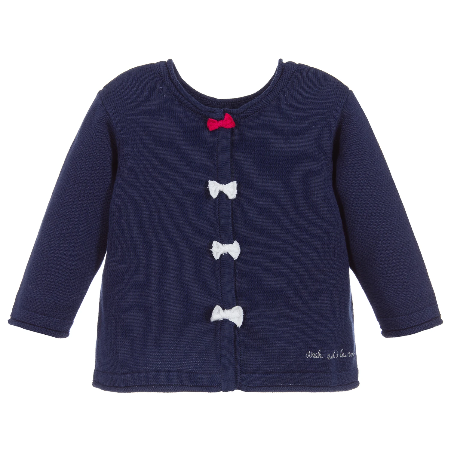Navy blue top for baby girls by Week-end à la mer. Knitted in soft cotton, it has little bows on one side and a fish motif on the other.
