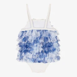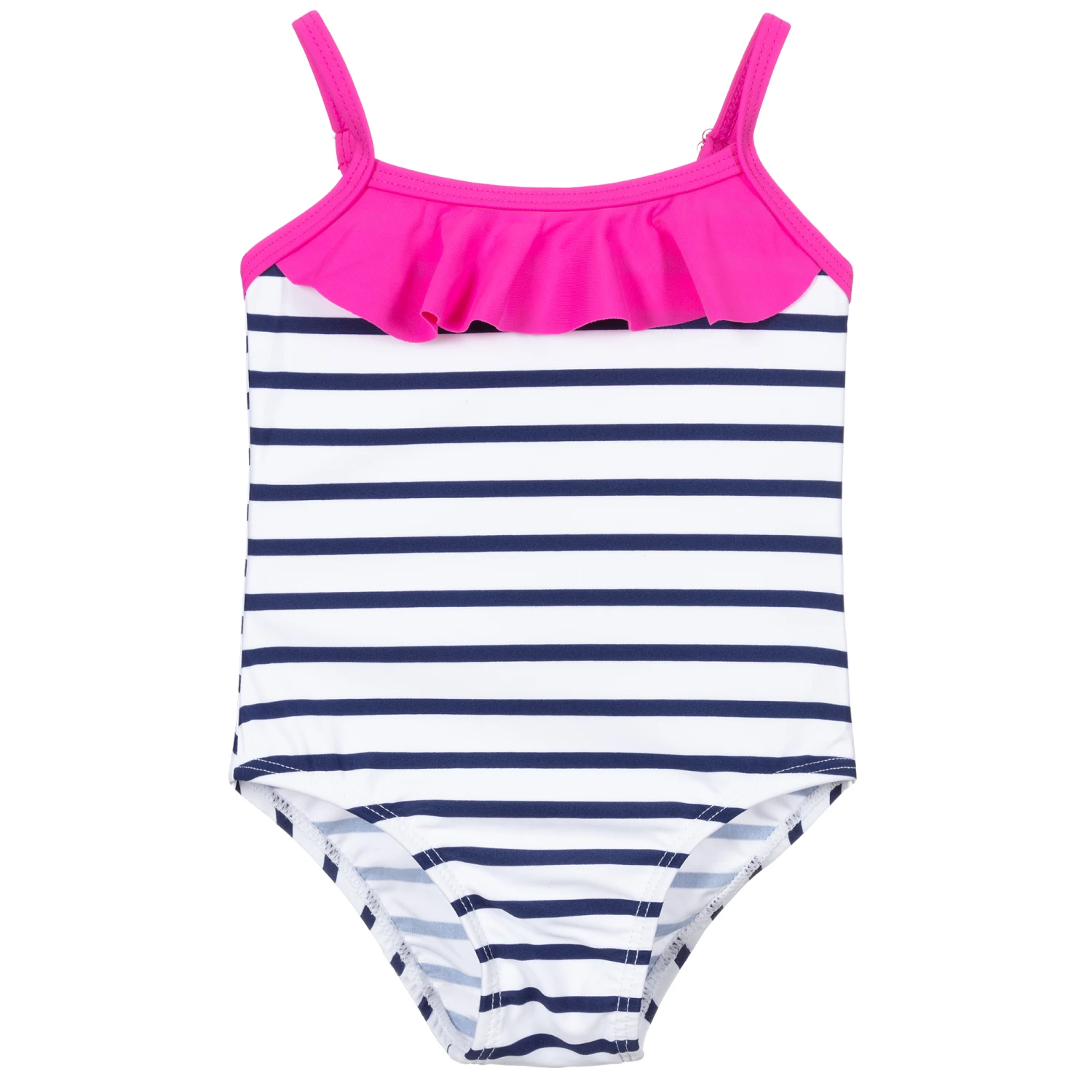 Navy blue and white Breton striped swimsuit for baby girls by Week-end à la mer. Soft, stretchy and silky, it is lined on the front and has a bright pink frill around the front with matching, adjustable shoulder straps.