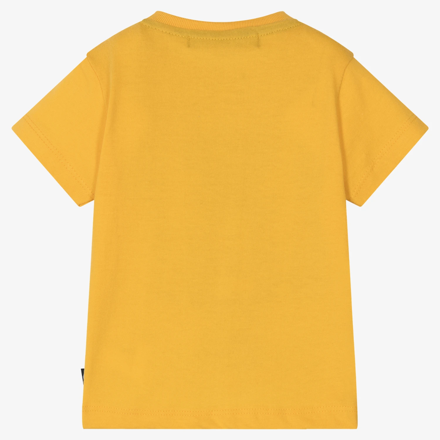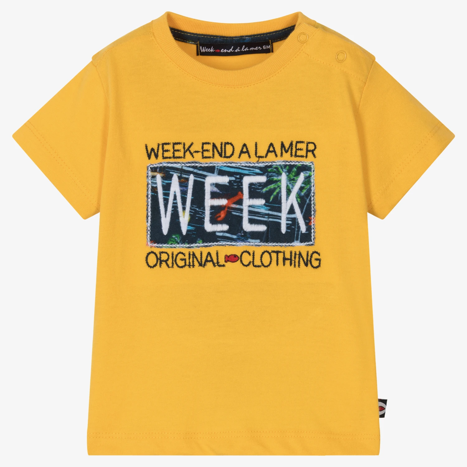 Golden yellow cotton T-shirt for little boys and girls by Week-end à la mer, made from soft, stretchy jersey. It has a seaside-themed embroidered patch on the chest, alongside the brand name in navy blue. There is a small logo tab on the side seam and shoulder popper fastenings for easy dressing.
